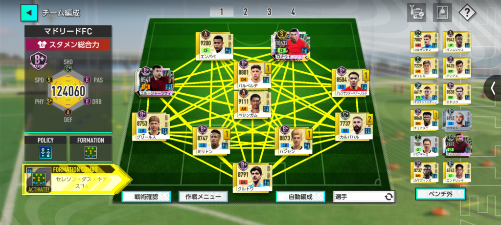画面左側に表示されている「セレソン・ダス・キナス^16」が、現在選択されているフォメコン(フォーメーションコンボ)となります。