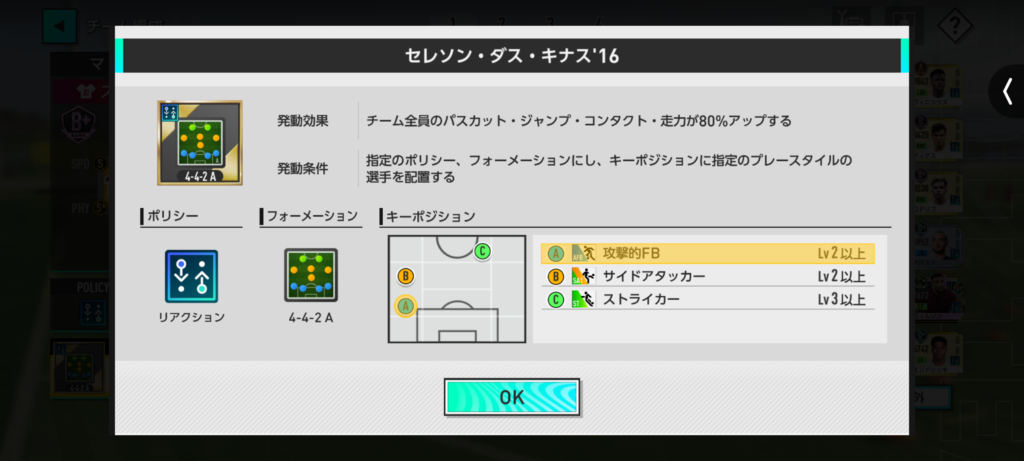 左側のフォメコンをタップすると、発動条件に必要な選手のスタイルなどの詳細が表示されます。