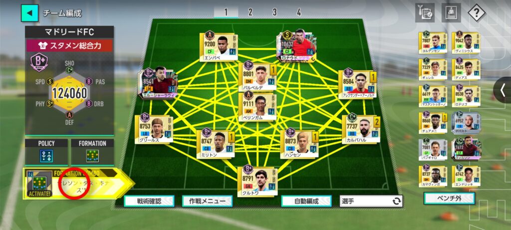 画面左下に赤丸が付いている箇所が「フォメコン(フォーメーションコンボ)」です。